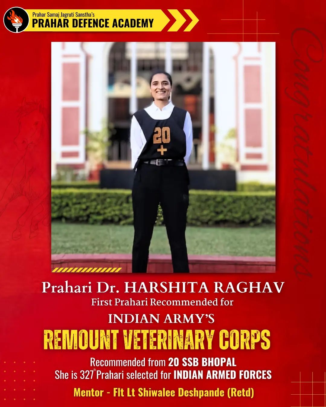 Flight Lieutenant Shivali Deshpande (Retd) is the Secretary of Prahar Samaj Jagurti Sanstha and Director of Prahar Defence Academy. She was commissioned in the Indian Air Force as a Pilot Officer for the Short Service Commission. She was the first girl in the country to command a passing-out parade at the Air Force Academy. She provides expert guidance to "Prahar Wadsaleeda Military School, a venture of Prahar Organisation, Conducts residential and non-residential adventure camps for school children, MBA students and also for corporate sectors.